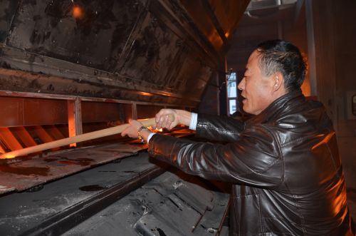 (城發(fā)公司副總經(jīng)理梁永慶,手持火把密切關(guān)注爐膛內(nèi)火焰燃燒的態(tài)勢。李波攝)
