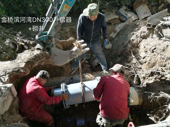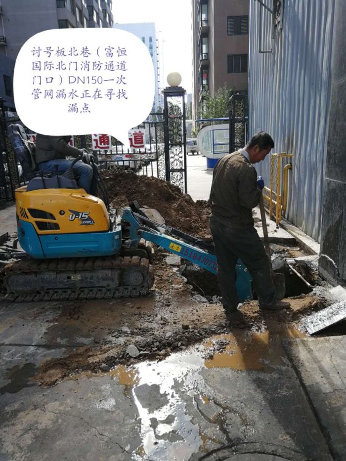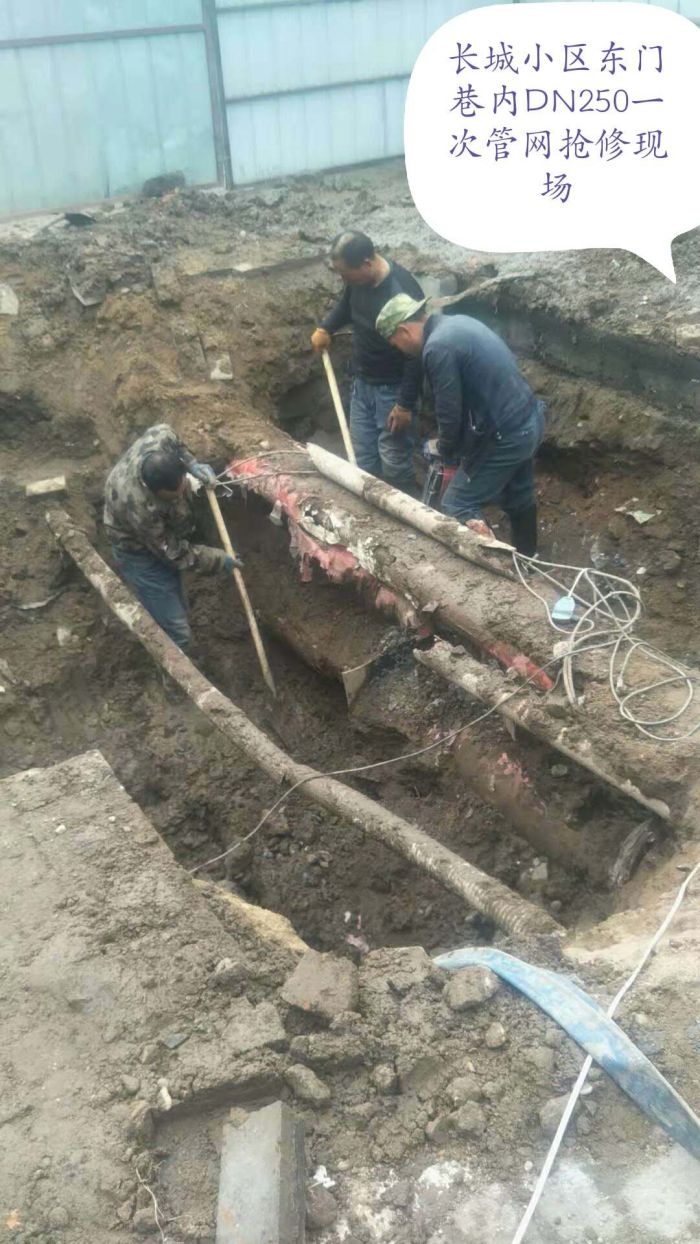 9月29日,管網(wǎng)公司接到辛家營供熱分公司搶修通知,騰飛南路如意廣場環(huán)形路口北側東綠化帶中發(fā)現(xiàn)一處冒水現(xiàn)象。管網(wǎng)公司領導高度重視,迅即安排人手,查找漏水點。他們憑借豐富的搶修經(jīng)驗,決定采用十字釘,直架設于涵管之上,創(chuàng)造人工作業(yè)通道,根據(jù)涵管內(nèi)水流方向判斷,搶修人員在胸腹部綁上滑板及護具,在DN600熱力管道中向西滑行50米左右,終于發(fā)現(xiàn)了漏水點。為了給供暖投運工作贏取時間,參與搶修的20余人輪班作業(yè),連續(xù)奮戰(zhàn)7個晝夜,10月6日,圓滿完成搶修任務。