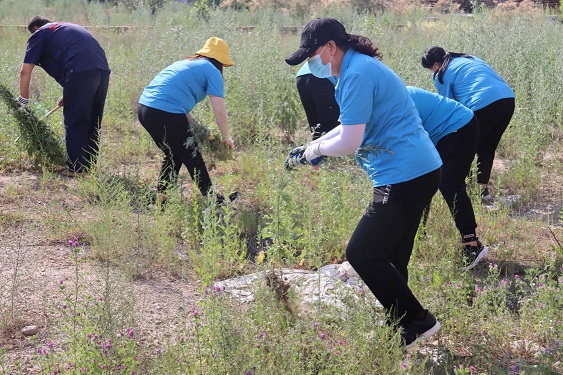 活動現(xiàn)場,黨支部書記娜仁、經(jīng)理史濤帶領大家在各自的責任區(qū)域內分片作業(yè)。大家在炎炎烈日下,揮汗如雨、干勁十足,有的拔除蒿草、有的收集清運……經(jīng)過一下午地辛勤作業(yè),小區(qū)及周邊的蒿草不見了,空氣清新了,環(huán)境也變美了。