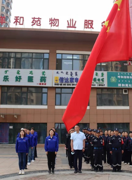 9月27日上午,城發(fā)物業(yè)公司黨支部聯(lián)合呼市住房保障和房屋管理局經(jīng)營管理處祥和苑公租房管理站在祥和苑公租房小區(qū)舉行“我和我的祖國——升國旗、唱國歌”獻(xiàn)禮中華人民共和國成立72周年活動。黨員、干部、職工共40余人參加此次活動。